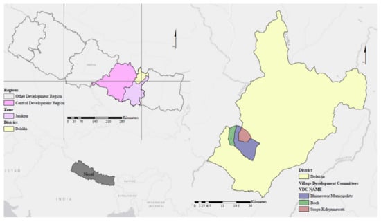 Three Village Development Committees (VDCs), Charikot (Bhimeshwar municipality), Susma chhemawati and Bocha were selected based on the following criteria: (a) accessibility—easy to access rural, remote mountainous areas, (b) scale of the field work support, (c) highly susceptible to extreme drought and rainfall. The total number of households is 6076 in Charikot, 775 in Bocha and 864 in Susma chhemawati. The average household sizes in the selected VDCs are 3.71, 3.61 and 3.98, respectively. In the three mentioned VDCs: firewood is the primary fuel used for cooking, electricity is the source of light, tap water is the source of drinking water, radio, mobile phone, and television are the main communication facilities, the major casts are Chetree in Charikot and Bocha, and Thami in Susma chhemawati, the dominant language is Nepali in Charikot and Bocha, and Thami in Susma chhemawati, and more than half of the population living in the three VDCs are literate []. Figure 2 presents Dolakha district in Nepal.