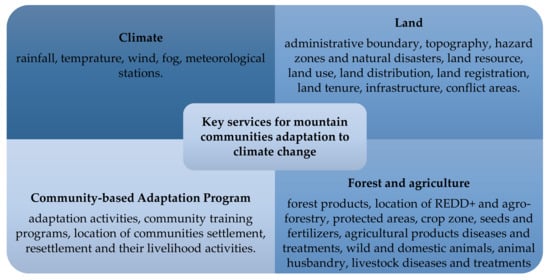 The ministries provide data and services based on their institutional responsibilities and not because of CAP. MCAS can integrate these data and services to contribute to CAP. LIS allows different datasets “to be organized using geographic coordinates” and “to be grouped according to locations” []. Figure 3 presents key services for mountain communities. The prioritized climate services in the line of CAP were identified, based on the analysis of the field work. Not all of these services are crucial or used for MCAS. Some of the services require sponsors or customization for a specific activity/reason.