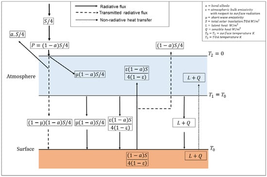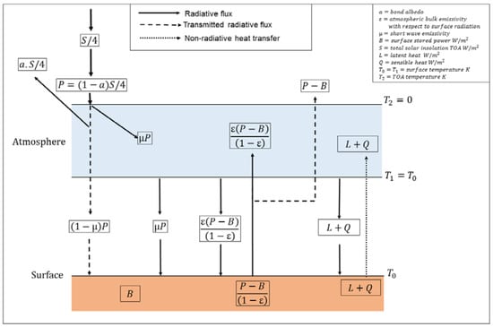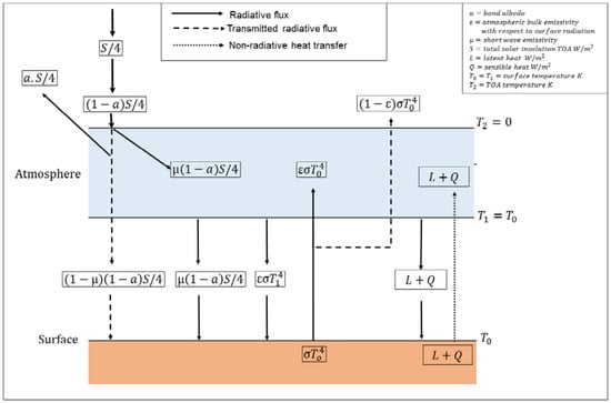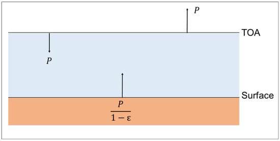 The physical interpretation of is that the TOA can be regarded as a non-radiating surface in the grey body model. Note that this condition is theoretically supported from both the convective (adiabatic) modeling from Equations (1)–(3), and radiative modeling from Equations (5) and (6).