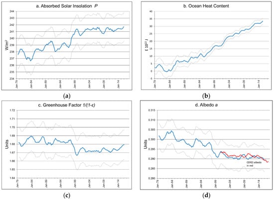 Since the surface flux shown in Figure 7e is the product of the greenhouse factor and absorbed solar insolation minus B, that is, it is clear from the model that increasing absorbed solar radiation, caused by a lowering of the bond albedo, was the driver of increased surface temperature during the period 1979–2015, and also of the increase in ocean heat content, as shown in Figure 7b. The model does not identify a cause for the decrease in albedo; the model is impartial. I may speculate that a decrease in atmospheric water content, apart from lowering atmospheric bulk emissivity, also leads to a decrease in cloud cover and therefore to a decrease in albedo.