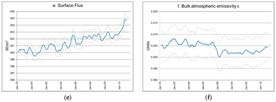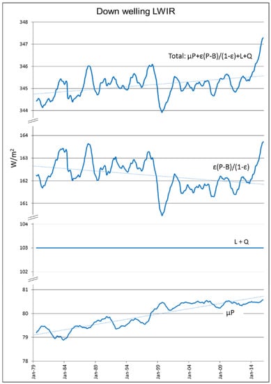 Figure 10 shows the 1979–2015 time-series behavior of the components of downwelling longwave radiation generated by the model. Here, neither P nor are constant. The component , our back radiation, in Figure 10 has seen a downward trend over the period, which is driven by a decreasing greenhouse factor. The component , which is atmosphere-absorbed incoming solar re-radiated as longwave toward the surface, has increased due to increased P, assuming constant atmospheric short wave emissivity . The rate of non-radiative surface-to-atmosphere heat transfer L + Q is assumed to be a constant value of 103 W/m2 over the same period. The sum of these components, as shown in the top curve in Figure 10, shows an increase in total downwelling longwave radiation over the period, which is driven by . Therefore, it is quite possible for total downwelling longwave radiation to increase, even when the greenhouse effect expressed through back radiation decreases. The graph demonstrates the principle, although the uncertainties associated with OLR used in the derivation of atmospheric absorbed solar and back radiation are significant.