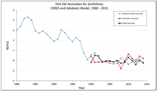 Figure 7a shows that the model identifies an increase in the absorbed solar radiation in the order of 3 W/m2 over the period. This increase is a direct result of the decrease in the bond albedo shown in Figure 7d, which shows a gradual decrease from a value of around 0.3 to 0.29 over the period 1979 to 1999, and then remains flat, with short-term fluctuations, over the period from 1999 to 2015. To validate the model-derived albedo, I added the CERES-derived albedo to the graph over the period 2000–2015 in Figure 7d, which is shown as the red line. In absolute terms, the values and the trends are in reasonable agreement, giving some confidence in the model-generated values in the prior period of 1979–2000. This should not be surprising, as Equation (14) is derived from the definition of bond albedo, using the HIRS 2.2 OLR dataset and B to derive absorbed solar, and PMOD for incoming TOA solar. In Figure 8, albedo is expressed as top of atmosphere anomalies in W/m2. The blue curve is generated from the adiabatic model using HIRS 2.2, as well as incoming solar and ocean heat content data; the red curve shows earthshine values as reported by Palle et al. (2016) [22], and the black curve is CERES data obtained in May 2018. Over the common overlap period between 2000–2014, the trends are −0.038 W/m2, 0.020 W/m2, and −0.022 W/m2 per annum for the adiabatic model, earthshine, and CERES anomalies respectively; that is, trends are near flat and in general agreement. The adiabatic model shows some minor deviation from the other datasets over the period 2008–2011, of an order of less than 1 W/m2.