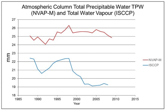 Figure 7c shows the time-series behavior of the greenhouse factor. The model identifies a slight decrease in this value over the period, which is also reflected in Figure 7f, of atmospheric bulk emissivity. A decreasing greenhouse factor means a weakening of the greenhouse effect. An immediate objection to this model outcome is that the increasing atmospheric greenhouse gas concentrations are well-documented over the time period. This objection is overcome when I consider that the bulk atmospheric emissivity ε is the sum effect of all of the greenhouse gases in the atmosphere. An increase in atmospheric non-condensing greenhouse gas concentration may be offset by a decrease in atmospheric water vapor, which is the dominant greenhouse gas; however, this model is not able to determine the magnitudes of the contributions of differing greenhouse gas species. There is differing evidence for decreasing atmospheric water content during the time period. Figure 9 shows graphs of Total Precipitable Water from the NVAP-M dataset [12] and Total Water Vapor from the ISCCP D2 dataset [11] over the period from 1988–2008. The ISCCP data support the interpretation of decreasing atmospheric water, particularly after 1998. The NVAP-M data show a decrease in atmospheric water over the period from 1998 to 2008, but of a much lower magnitude than the ISCCP data, and the overall trend from 1988 does not show a decrease. Hence, the NVAP-M data over the period from 1988–1998 do not support an interpretation of decreasing atmospheric water vapor.