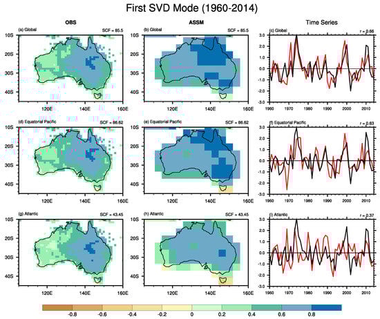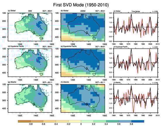 There is evidence that the Atlantic ocean may affect the tropical Pacific climate variability [25,26,27,29], and, in turn, potentially affect Australian precipitation [30]. To identify the Atlantic origin of Australian precipitation variability, we applied the SVD analysis to the Australian precipitation variability between the observations and ensemble means of the Atlantic partial assimilation runs (Figure 1g–i and Figure 2g–i). The first SVD modes in the Atlantic partial assimilation runs explained 43.5% in the CESM and 65.1% in the MIROC for total covariance, which were well separated from higher modes (the SCFs of second SVD modes in the CESM and MIROC are 17% and 11.1%, respectively). The correlation coefficients of the principal components in the leading SVD modes were statistically significant ( in the CESM and in the MIROC). The Atlantic partial assimilated experiment also captured a very similar positive monopole-like pattern for the observed precipitation variability that was comparable to the global and equatorial Pacific runs (Figure 1 and Figure 2). The observed principal components of the first SVD modes in the global, equatorial Pacific, and Atlantic runs were almost identical to each other (black lines in Figure 1c,f,i and Figure 2c,f,i; ). In addition to the Australian precipitation variability, the observed SST and SLP anomalies correlated with these first SVD modes and also showed indistinguishable patterns from each other (left panels in Figure 4 and Figure 5). Even though the model-simulated precipitation variability is driven by the different ocean basins, the SVD analysis captured the same observed precipitation variability in Australia.