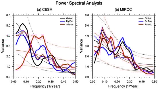 Power spectrum for the principal components of the first SVD mode in observations (broken lines) and model simulations (thick solid lines) in the global (black), equatorial Pacific (blue), and Atlantic (red) assimilation runs in the (a) CESM and the (b) MIROC. The thin solid line and thin dotted line correspond to the power spectrum of a fitted first order Markov process and its 95% and 5% confidence limits for model simulations in the Atlantic (red) and global (black) runs, respectively.
