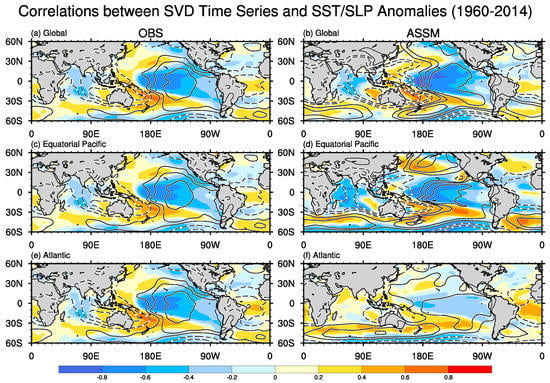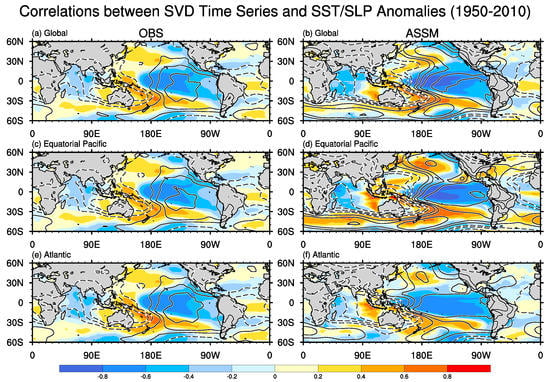 Correlation maps of sea surface temperature (SST) (shade) and sea level pressure (SLP) anomalies (contour: solid and broken lines are positive and negative correlations, respectively) associated with the first SVD mode between the (left) observations and the (right) MIROC simulation in the (a,b) global, (c,d) equatorial Pacific, and (e,f) Atlantic assimilation runs during 1950–2010. This figure is the same as Figure 4 but for the MIROC.