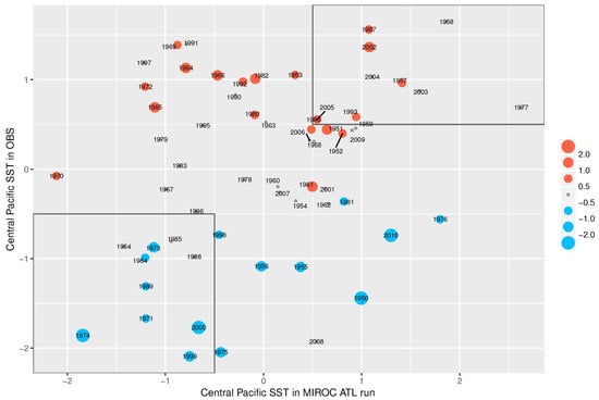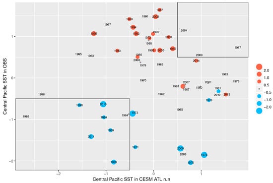 Scatterplot of large-scale SST anomalies (SSTAs) averaged over the Niño 4 region in observation and the CESM Atlantic partial assimilation run from 1960–2014. The Niño 4 values were standardized with the standard deviation of the dataset. Composite years were chosen for those exceeding or being less than and standard deviations for both the observations and the Atlantic partial assimilation runs (black box). The dot size and color indicate the observed principal components in the SVD analysis between the observation and the Atlantic partial assimilation runs (black line in Figure 1i). .