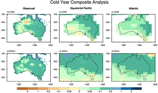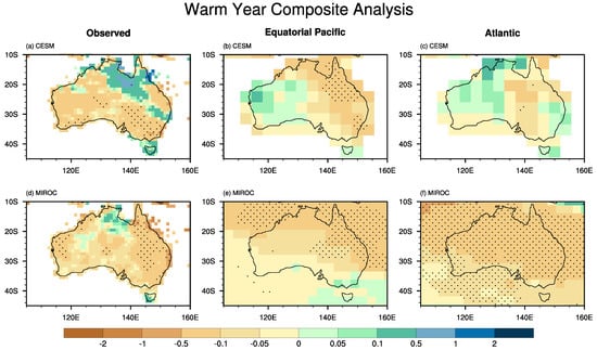 Using the cold and warm years extracted from the scatter plots of the central tropical Pacific SSTAs (Figure 6 and Figure 7), we conducted a composite analysis of annual precipitation anomalies in Australia (Figure 8 and Figure 9). Consistent with the SVD analysis, the observed annual precipitation anomalies tended to show wet conditions for the entirety of Australia during cold years, but dry conditions were observed during warm years (left panels in Figure 8 and Figure 9). During cold years, in particular, the enhanced precipitation anomalies in Eastern Australia were well simulated in the equatorial Pacific and the Atlantic partial assimilation runs of both the CESM and MIROC (Figure 8). We can also confirm the consistency with the SVD analysis, whereby those cold years showed larger observational principal components in the first SVD mode (blue dots in Figure 6 and Figure 7), except for 1964, 1985, and 1988. Similar features, but in an opposite phase, were also obtained in the warm year composite in the MIROC (bottom panels in Figure 9), though the warm year composite in the CESM showed a noisier pattern because of the smaller sampling number of warm years (only three years; upper panels in Figure 9). Additionally, in the warm composite years, precipitation anomalies in the CESM Atlantic run showed almost no statistical significance over Australia (black dots in Figure 9c). Because of this lesser Atlantic impact on the warmer SSTAs in the central tropical Pacific, the Atlantic partial assimilation run in the CESM, compared to the MIROC, showed a weaker impact on Australian precipitation variability.