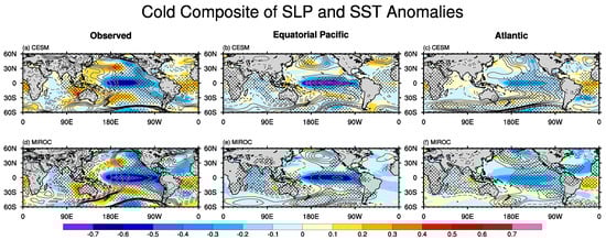Annual mean SST (color interval is C) and SLP anomalies (contour interval is 0.2 hPa) in (a,d) observation, the (b,e) equatorial Pacific, and the (c,f) Atlantic partial assimilation runs during the cold year composites in the (top) CESM and the (bottom) MIROC. The dotted region is above the 90% significance level using Student’s t-tests for SLP anomalies.
