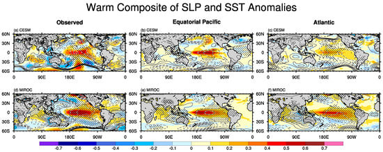 Annual mean SST (color interval is C) and SLP anomalies (contour interval is 0.2 hPa) in (a,d) observation, the (b,e) equatorial Pacific, and the (c,f) Atlantic partial assimilation runs during the warm year composites in the (top) CESM and the (bottom) MIROC. The dotted region is above the 90% significance level using Student’s t-tests for SLP anomalies.