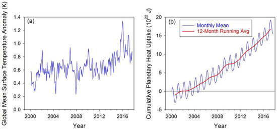 (a) National Aeronautics and Space Administration Goddard Institute for Space Studies Surface Temperature Analysis (GISTEMP) global mean surface air temperature anomaly relative to 1951–1980 climatology and (b) Clouds and the Earth’s Radiant Energy System (CERES) cumulative planetary heat uptake for March 2000–September 2017.