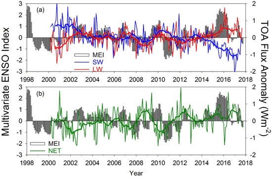 For the entire available CERES period, the average rate of heat uptake is 0.67 Wm−2, and the standard deviations in annual and monthly anomalies are 0.33 Wm−2 and 0.69 Wm−2, respectively. The large variability is mainly due to El Niño–Southern Oscillation (ENSO) [14]. Figure 2a,b illustrate how global TOA flux anomalies in reflected SW, emitted LW and net downward radiation vary along with the Multivariate ENSO Index (MEI). We define SW and LW TOA fluxes as positive upwards and net TOA flux as positive downwards, following the convention used in the CERES data products. Appreciable positive SW and negative LW anomalies are observed at the beginning of the CERES record (Figure 2a), which coincides with a prolonged period of La Niña conditions that started in mid-1998 and ended in mid-2001. After 2002, SW and LW anomalies remain relatively weak until 2014, when SW anomalies sharply decrease and LW anomalies increase. The SW anomalies after 2014 are particularly noteworthy as they reach −2 Wm−2 in January 2017, one year after the peak of the 2015–2016 El Niño event. In contrast, the net TOA radiation anomalies (Figure 2b) are relatively small early in the record owing to cancellation between SW and LW anomalies, but become appreciable in the middle of the record when modest SW and LW TOA flux anomalies of the same sign combine (e.g., minima in 2002 and 2010, maxima in 2008 and 2012). After 2014, net TOA flux anomalies are generally positive due to the large negative anomalies in reflected SW, which overwhelms positive outgoing LW anomalies. The positive anomalies in net TOA flux following the 2015–2016 El Niño stand in marked contrast with those for the other El Niño events during the CERES period (2002–2003, 2004–2005, 2006–2007 and 2009–2010). Following those events, net TOA flux anomalies are generally negative.