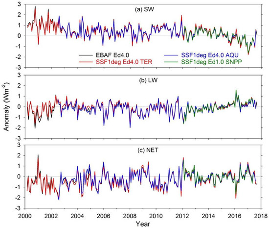 In order to gain confidence that the TOA flux anomalies from EBAF Ed4.0 are robust, we compare them with TOA flux monthly anomalies from the SSF1deg Ed4.0 products for Terra, Aqua and S-NPP (Figure 3a–c). The EBAF Ed4.0 processing relies on CERES Terra measurements from March 2000-June 2002 and combined Terra and Aqua for July 2002–September 2017. EBAF Ed4.0 also supplements the CERES measurements with MODIS for scene information and geostationary imager measurements to capture variations in the diurnal cycle [31]. In contrast, the SSF1deg data product relies only on CERES and MODIS or VIIRS and is produced separately for each mission. As shown, there is excellent agreement between the different data products. All four datasets show a decline in SW anomalies and positive anomalies in LW TOA flux following the 2015–2016 El Niño. Root-mean-square (RMS) differences between EBAF Ed4.0 and the 3 SSF1deg records are <0.12 Wm−2 for SW, <0.16 Wm−2 for LW and <0.17 Wm−2 for net TOA flux (Table 2).