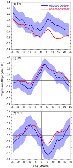 To further highlight how unprecedented the SW anomalies are during the last 3 years of the record (i.e., post-hiatus period), Figure 4a–c show lagged regressions between TOA flux anomalies and anomalies in the Niño 3.4 index for March 2000–June 2014 and for the entire CERES record (March 2000–September 2017). Consistent with other studies [4,45], Figure 4c shows that when TOA net radiation leads Niño 3.4 (negative lags), the regression slopes are positive for lags of up to 15 months. Conversely, when Niño 3.4 leads (positive lags), regression slopes are negative over the same period. Thus, a major El Niño occurring at zero lag would tend to be preceded within a year or so by an uptake of heat into the system and followed by a release of heat out of the system. This pattern is mainly driven by outgoing LW radiation (Figure 4b), which shows negative anomalies prior to an El Niño event and even stronger positive anomalies a few months following an El Niño, when surface temperatures are larger [46]. However, when the entire CERES record that includes the last 3 post-hiatus years is considered (red line), regression slopes for net and SW TOA flux (Figure 4a,c, respectively) fall outside of the 95% confidence intervals for positive lags. The unprecedented negative reflected SW anomalies following the 2015–2016 El Niño significantly alter the statistical TOA net radiation response following an El Niño event. Including this event reduces the amount of heat released out of the system following an El Niño relative to that expected based upon the first 14 years of the CERES record.