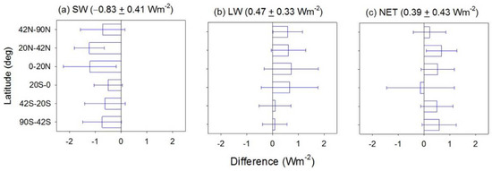 Zonal mean TOA flux differences between the post-hiatus (July 2014–June 2017) and hiatus (July 2000–June 2014) periods are shown in Figure 5a–c. The six latitudes zones cover approximately the same area, so that each latitude zone contributes equal weight to the global mean. SW TOA flux mean differences are negative in each latitude zone, but exceed the 95% confidence interval only in the northern hemisphere (NH) tropics and subtropics. In contrast, LW TOA flux differences are positive in each latitude zone, but remain within the 95% confidence interval everywhere. Since the magnitudes of the differences are generally greater in the SW than LW, net TOA flux differences are positive in most latitude zones, except the southern hemisphere (SH) tropics. On a global average, mean differences between the post-hiatus and hiatus periods are: –0.83 ± 0.41 Wm−2, 0.47 ± 0.33 Wm−2 and 0.39 ± 0.43 Wm−2 for SW, LW and net, respectively. It is worth noting that the corresponding global mean solar irradiance difference is only 0.03 ± 0.13 Wm−2, and therefore has a negligible impact on radiation budget differences between these two periods.