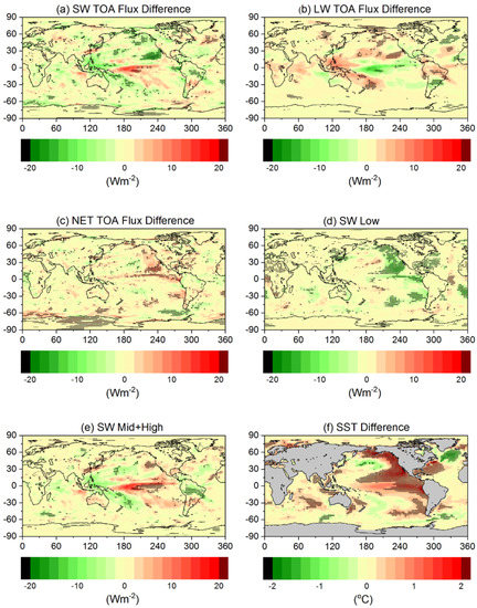 In the tropics, positive differences in SW TOA flux over the central Pacific are associated with an eastward shift in convection during the 2015/2016 El Niño (Figure 6e), which also reduces LW TOA flux (Figure 6b). Mayer et al. [53] note that even though SSTs were extreme, the tropical Pacific upper ocean gained heat owing to a reduction of the Indonesian Throughflow volume and heat transport of warm water from the Pacific to the Indian Ocean. This differs from the previous major El Niño in 1997/1998, in which there was appreciable upper ocean heat loss.