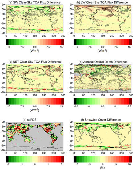 We applied the perturbation methodology to isolate the impact of various parameters on global mean clear-sky SW TOA flux (Figure 9). Not surprisingly, aerosol and surface albedo variations explain most of the SW TOA flux variability. Surface albedo changes are primarily from snow/ice changes (Figure 8f) over the Arctic and Southern Ocean adjacent to Antarctica. Similarly, negative differences in clear-sky SW TOA fluxes over western Canada and northern U.S. states are associated with decreases in snow cover. Over the central US and Mexico, SW TOA flux differences appear to correspond to differences in the self-calibrating Palmer Drought Severity Index (scPDSI) [42] (Figure 8e). As shown in Table 3, positive (negative) values of scPDSI indicate wetter (drier) soil conditions. Positive scPDSI differences over the western U.S. implies that wetter soil conditions occurred in more recent years compared to the first part of the century. Weiss et al. [59] note that both warmer temperatures and low precipitation were the cause for the greater soil moisture deficits. Since surface albedo tends to be lower in wetter surface soils [60], this likely is the reason for the lower SW TOA fluxes in these regions.