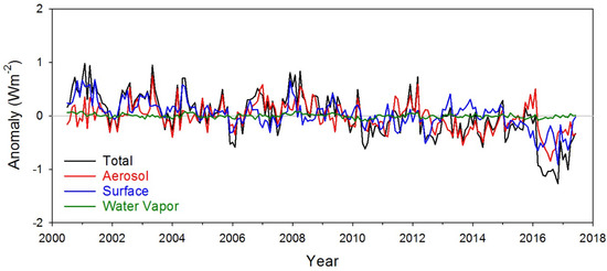 - Paulot, F.; Paynter, D.; Ginoux, P.; Naik, V.; Horowitz, L. Changes in the aerosol direct radiative forcing from 2001 to 2015: Observational constraints and regional mechanisms. Atmos. Chem. Phys. 2018. [Google Scholar] [CrossRef]