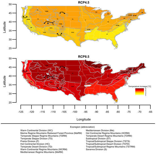Map of multi-model mean temperature changes between 1955–2005 and 2050–2099 over the relevant Bailey’s divisions under the representative concentration pathway (RCP) 4.5 (top) and RCP 8.5 emission scenarios (bottom). Regions with insufficient fire occurrence data for analysis are colored white.