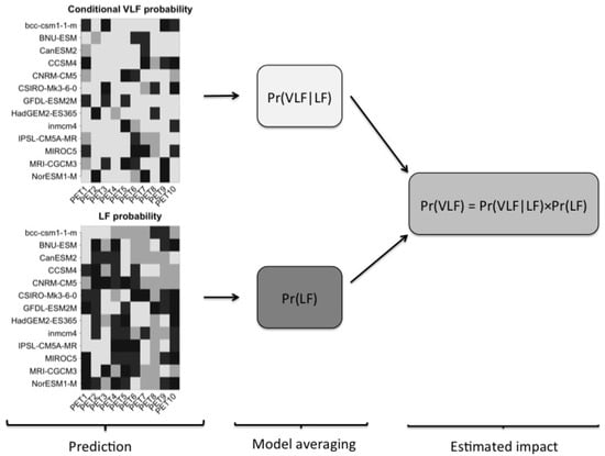 The posterior was approximated using Just Another Gibbs Sampler (JAGS) software (Plummer 2003 []) and the runjags package in R (R Development Core Team 2008 []). An initial set of 30,000 samples were generated from three parallel Markov Chain Monte Carlo chains using a burn-in interval of 10,000 steps, adaptive phase of 10,000 steps, and thinning interval of 100. Calculations were performed on a MacBook Pro (Quanta Computer, Inc, Shanghai, China) with a 2.7 GHz Intel Core i7 processor (Hillsboro, Oregon, USA). Convergence was monitored visually, and also via the calculation of the potential scale reduction factor, using the range of the central 90th percentile of the marginal posteriors as a test statistic (Brooks and Gelman 1998 []). We assume that the second half of the chain has approximately converged if the maximum potential scale reduction factor fell below 1.01. If the chain had not converged, then it was continued in batches of 1000 iterations until the maximum potential scale reduction factor was less than 1.01 (Gelman and Shirley 2011 []). To provide guidance to future analysts looking to perform similar analyses, an informal computational comparison of JAGS (Version 4.3.0) and Stan software (Version 2.17.3) was completed, which is described in the supplementary materials. The final VLF probabilities can then be calculated by averaging both probabilities of interest—either with point estimate averages of the model weights or using the full posterior in the weighted approach—and applying Bayes rule (Figure 2). The resulting distribution of VLF probability time series is then used to estimate the changes in VLF frequency in the future by finding the difference between the expected number of VLFs in the historical climate (1956–2005), and the expected number of VLFs in the future (2050–2099) under moderate and severe warming scenarios, RCP 4.5 and RCP 8.5, respectively.