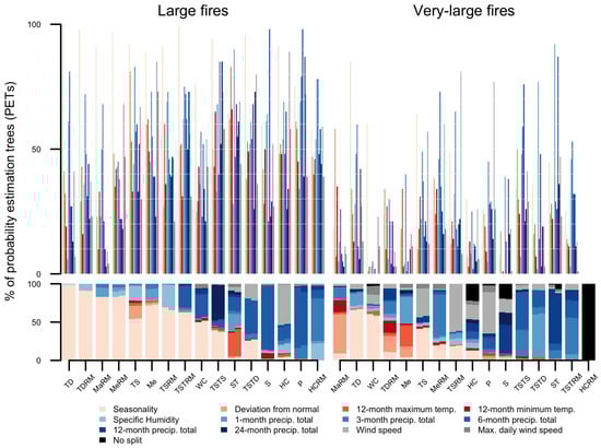 Two quantities are estimated for each month and region, the probability that at least one LF (>404 hectares) occurs and the probability that a VLF occurs conditional on the occurrence of at least one LF. These probabilities are estimated using multi-model averages of a flexible and powerful type of binary classifier known as a probability estimation tree (PET). PETs use decision-tree structures to recursively divide the data with binary splits, eventually grouping all the data into mutually exclusive categories or leaves. With respect to the response, the splits create increasingly homogeneous clusters of observations, which also occupy an increasingly specific portion of the covariate space. Within the context of this analysis, we have 12 meteorological predictors available to form these categories, so that months—in which certain fire events did or did not occur—can be grouped into categories describing broadly similar environmental conditions. Prediction is performed by using the relevant covariates to identify the appropriate category, and taking the empirical frequency of the binary responses in that category as a probability estimate (Provost and Domingos 2000 []). While it is well known that predictions based on individual decision tree algorithms can be highly variable with significant levels of structural instability (Wang et al., 2016 []), these pathologies are often lessened through the use of model averaging (Provost and Domingos 2000 []). To that end, a suite of 100 PETs are generated for each region and for both probabilities of interest; and we will hereafter refer to each collection of 100 PETs as a ‘forest’. Each individual PET within a forest is generated stochastically by applying the C4.5 learning algorithm without pruning (Quinlan 1993 []; Provost and Domingos 2000 []) to a random sample of the training dataset via the Roughly Balanced Bootstrapping algorithm (Hido et al., 2009 []). The LF forests and the conditional VLF forests are constructed somewhat differently in that the LF forests sample from all months in the training dataset, while the VLF forests are based only on samples of months in which at least one LF has occurred. In other words, the LF forests will discriminate between LF and no-fire months, and the VLF forests will discriminate between LF and VLF months. Identification of important predictors within each forest are assessed using two summary statistics: (1) the frequency that a predictor is present in the PETs; and (2) the frequency that a predictor is used in the first split of the PETs. The former identifies the frequency with which a given meteorological predictor is used at all within the forest, and the latter identifies the frequency with which a meteorological predictor is the best determinant of the response on a randomly generated dataset.
