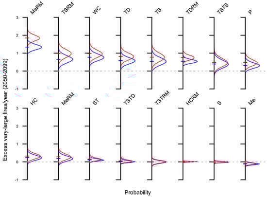 Kernel density estimates of the posterior and mean of the number of additional very-large fires per year relative to the 1956–2005 reference period per year by ecoregion under the representative concentration pathway (RCP) 4.5 (blue) and RCP 8.5 (red) scenarios arranged by magnitude of change. The excess very-large fire frequency is calculated by randomly sampling () from the posterior of historical (1956–2005) and future (2050–2099) multi-model averages and calculating the difference.