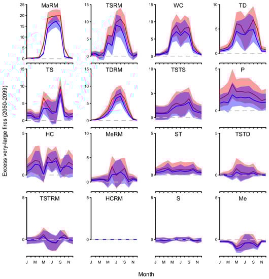 Predicted intra-annual changes in very-large fire frequency across sixteen biogeographical regions within the Continental United States under the RCP 4.5 (blue) and RCP 8.5 (red). The central 90th percentile and mean of the excess very-large fires are based on 1,000,000 random samples of the posterior multi-model average very-large fire probabilities from the historical (1956–2005) and future (2050–2099) scenarios.