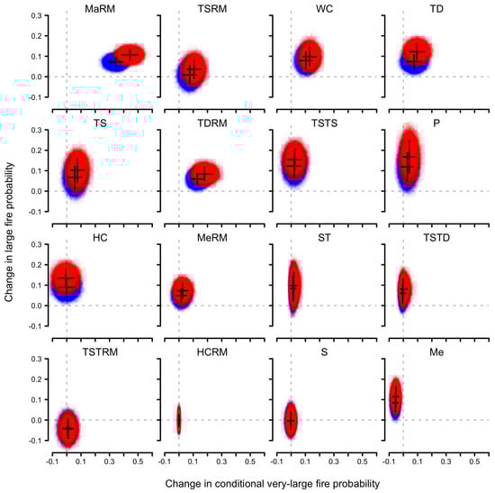 Simulated change in monthly multi-model large-fire and conditional very-large fire probability estimates across biogeographical divisions of the continental United States. The point cloud is a sample of 100,000 differences in average posterior probability components under the historical (1956–2005) and future scenarios (2050–2099); with the RCP 8.5 scenario colored red and RCP 4.5 colored blue. The solid black lines represent the central 90th percentile and the dashed lines are horizontal and vertical lines passing through the origin.