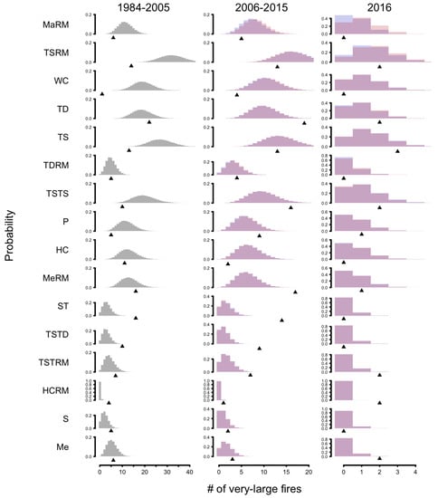 Simulated and actual very-large fire month counts for each region and three time periods: 1984–2005, 2006–2015, and 2016. A sample of 100,000 simulated very-large fire (VLF) counts are produced under historical (grey), RCP 4.5 (blue), and RCP 8.5 (red) scenarios by randomly selecting a VLF probability time series from the posterior and randomly generating a VLF occurrence time series. The observed VLF counts are represented with arrows.