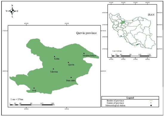 The province of Qazvin has an area of 15,821 km², located between 48–45 to 50–50 East of the Greenwich Meridian of longitude and 35–37 to 36–45 North latitude of the Equator. Its average altitude is 1278 m above sea level. It has a semi-arid climate with the annual mean precipitation, daily mean temperature, and relative humidity of 301 mm, 14.2 °C, and 51%, respectively. The province is affected by Siberian and Mediterranean winds, which are considerably important factors in controlling the climate of the province. The geographical situation of the studied area is shown in Figure 1.