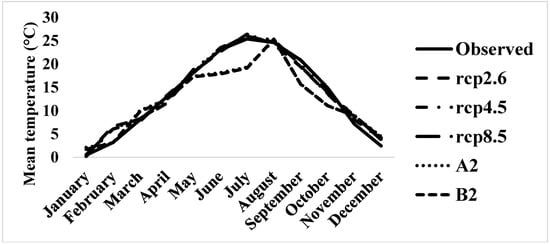 All three CanESM2 scenarios predicted that the daily mean temperatures would generally increase in the periods 2010–2039, 2040–2069, and 2070–2099 (Table 2). However, the scale of these increases differed by the different scenarios. The scenario rcp2.6 projected that the daily mean temperature of the periods 2010–2039, 2040–2069, and 2070–2099 would be 13.6, 13.9, and 13.9 °C, respectively, which are 0.9, 1.2, and 1.1 °C higher when compared to the observed daily mean temperature. The other scenario rcp4.5 also predicted an increasing trend in the daily mean temperature in the three prospective periods and showed that the mean daily temperature would be 13.4, 14.2, and 14.4 °C in the periods 2010–2039, 2040–2069, and 2070–2099, respectively, each being 0.7, 1.4, and 1.6 °C higher when compared to the observed one. The scenario rcp8.5 predicted the highest temperature trends in comparison with the other two scenarios. It predicted that the mean daily temperature would rise by 13.8, 14.8, and 15.5 °C in the periods 2010–2039, 2040–2069, and 2070–2099, with changes of 1.0, 2.0, and 2.7 °C, respectively, in analogy with the observed value.