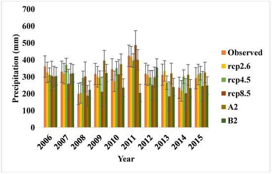 Overall, the three scenarios of CanESM2 projected a diminishing trend in the annual precipitation for the future periods 2010–2039, 2040–2069, and 2070–2099, when compared to the observed period (Table 4). However, the scenario rcp2.6 projected a less decreasing trend in the annual precipitation for the period 2070–2099. The scenario rcp2.6 predicted that the annual precipitation would drop to 287 and 277 mm in the periods 2010–2039 and 2040–2069, respectively, and decrease to 296 mm in the period 2070–2099. The projected annual precipitation by the scenario rcp4.5 would be 258, 264, and 293 mm in the periods 2010–2039, 2040–2069, and 2070–2099, respectively. The other scenario rcp8.5 forecasted that the annual precipitation would be 283, 278, and 278 mm for the periods 2010–2039, 2040–2069, and 2070–2099, respectively.