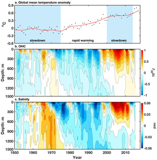 Which ocean should we look at to find the subsurface signal? It is reasonable to look at the ocean basin that contributes most to the slowdown in the global-mean surface temperature. As reviewed in Section 2, and in Chen and Tung [7], the variation of the global-mean surface temperature at decadal and interdecadal time scales is contributed mostly by an Atlantic pattern. The Pacific’s contribution to the global mean surface temperature variation is mostly at the interannual scales (specifically the interannual El Niño-Southern Oscillation (ENSO) timescales). Its contribution at decadal and longer timescales is small and was found to be one order of magnitude smaller than that by the Atlantic [7]. The Atlantic Meridional Overturning Circulation (AMOC) is strongly implicated as the cause of the change in sea-surface temperature in the form of Atlantic Multidecadal Oscillation (AMO) in models [8,9,10,11]. In a recent publication on observational evidence of AMOC’s variation and its effect on the global-mean surface temperature, Chen and Tung [9] examined the subsurface change associated with variation of AMOC in the recent decades. The acceleration of AMOC started in 1993, reaching a peak in 2005. Then it declined, and will soon reach the previous low level, 26 years later. Chen and Tung [12] argued that a period of rapid warming may resume and that period may last over two decades. During AMOC’s accelerating phase before 2005, deep convection increased and more heat was transported downward in the subpolar Atlantic. The heat that was transported into the deeper layers was sequestered, depriving the surface of the heat that would have warmed it. Unlike the preindustrial era, however, the surface still warms for a while because of the presence of greenhouse heating even though some of the heating is sequestered in the oceans. It took 6 years for the ocean sequestration to overcome the addition of heat from above, until 1999, for the surface to experience a noticeable slowdown in global warming.