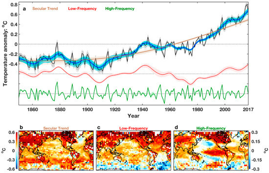 The relevant question seems to be: what caused the low-frequency variability that has contributed to the alternating periods of global-mean warming acceleration and slowdown? Figure 3a shows the observed global average of the HadCRUT4.3 land + ocean surface temperature [4,15] (in black) and its smoothed version (in blue). It is seen that the global-warming slowdown in the 21st century and the prior hiatus in mid-20th century exist in the smoothed data, with interannual fluctuations (green) superimposed upon the smoothed, multidecadally varying, platform. The high-frequency fluctuation is mostly associated with ENSO, as its associated spatial pattern is the cold-tongue pattern in the equatorial Pacific, seen in Figure 3d. Zhang et al. [16] and Chen and Wallace [17] emphasized that equatorial wave dynamics (Kelvin waves and Rossby waves) are mainly responsible for the interannual “ENSO cycle”, with a spectral peak of ~2–7 years and the tight cold-tongue shape near the equatorial Pacific. The spatial pattern associated with the secular trend (Figure 3b), on the other hand, has the typical pattern of anthropogenic forced warming, with more uniformed warming over the globe, but warmer continents than over oceans, and with a characteristic cool “warming hole” in the North Atlantic [18].