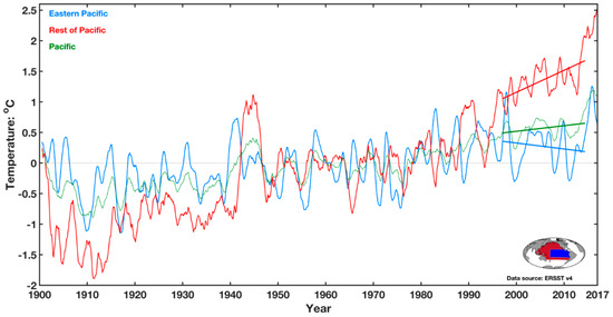 East vs. West Pacific SST (relative to 1961–1990 mean): The mean SST of the eastern tropical Pacific in blue curve (with weight = 1), and the mean SST of the rest of the Pacific (area weighted by 1.86). The mean SST for the Pacific basin as a whole is in green. The regions used are depicted in the inset. The blue region in the eastern Pacific is the same as that used in Kosaka and Xie [38] and is 35% of the Pacific basin. The SST time series have been smoothed using 27-month running mean. The linear trend, using the same color as the SST for each region, is objectively determined by least-square linear regression.