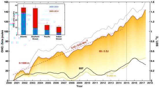 Global mean SST and OHC relative to 1998: SST from ERSST.v4 is in black and 0–200 m OHC in light orange curve, showing that they co-vary and both are in a warming slowdown, while the “total” OHC, as approximated by the 0–1500 m OHC in red curve, is increasing at the regressed linear rate of 0.42 W·m−2 (red dashed straight line). The orange shaded region is the amount of heat stored in the 200–1500 m layer, and it is about 89 zetajoules for the period 2000–2014. The data were adjusted by us for the Southern Ocean to remove a possible artifact due to the rapid transition from no-Argo to Argo observing platform around 2002–2003, as pointed out by Cheng and Zhu [65]. The original data [66] for the unadjusted 0–1500 m OHC are shown in grey. The inset shows the division of the 89 zetajoules of the global ocean increase in heat storage in 200–1500 m (linear trend multiplied by the number of years) into the four ocean basins. Note that the definition of the Southern Ocean in oceanography and here is south of 35S. The tip of the Drake Passage is at 38S. The error bars are from the linear trend regression. For the subsurface ocean heat content we use Ishii data [66], which is available up to 2012. Most of the recent measurements are from the Argo floats [62].