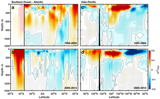 Of the 89 zettajoules of increased storage in the global oceans between 200 and 1500 m for 2000–2014, a majority of the heat storage increase (63 zettajoules, or 70%) occurred in the Atlantic and the Southern Oceans, with the Indian Ocean (14 zettajoules) and the Pacific (11 zettajoules) playing secondary roles (see Table 1). The Argo floats did not reach full coverage of the Southern Ocean until 2004 or 2005, but the coverage by a combination of expendable bathythermographs and Argo floats was probably adequate since 2000 in the North Atlantic. These instruments in the Atlantic showed that the Atlantic’s uptake in the 200–1500 m layer was 31 zettajoules (60% of the corresponding global value) between 2000 and 2005, as AMOC sped up [68], thereby increasing the subduction of warm saline waters in the subpolar Atlantic [54]. AMOC then slowed after 2005, as measured by the RAPID array [69,70], and the Atlantic subducted little additional heat. Then the Southern Ocean picked up most of the heat storage, accounting for 27 zetajoules of heat in the layer between 200 m and 1500 m between 2005 and 2014 (54% of the global value). Thus, the Atlantic and the Southern Oceans in turn carried the majority of the increase in heat uptake in the 200–1500 m of the global ocean. This way of accounting does not use the poorer data of the Southern Ocean prior to 2005.