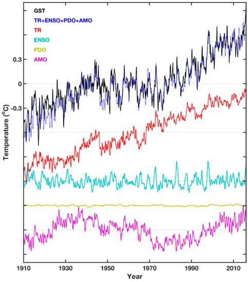 Despite its name, the main component of the IPO is actually the AMO, along with some PDO and ENSO. They are “mode-mixed” because of the low-pass filtering. See Figure 7, showing the composition of the IPO. At decadal filtering commonly used, ENSO is almost entirely filtered out. There is a small trend (TR) and a small PDO component. The largest component is the AMO. Chen and Tung [7] found that it is actually the AMO component in some of the IPO indices that appear to mimic the low frequency variation of the global-mean surface temperature. The PDO contributes very little to the global-mean surface temperature (see Figure 8), because of its compensating warm and cold centers of action, as shown in more detail in Chen and Tung [7].