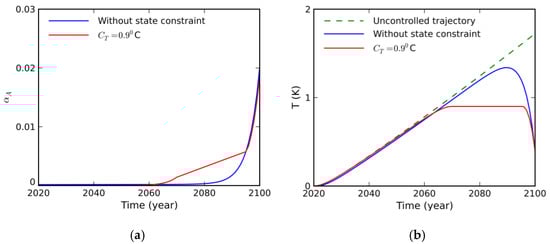where is the threshold parameter whose value should be set. The meaning of the condition (Equation (23)) known as a path constraint is that throughout the geoengineering project, the global mean surface temperature change should not exceed a certain value , which is determined a priori. We should highlight that state constraints add a great deal of complexity to the OCP [77,78].