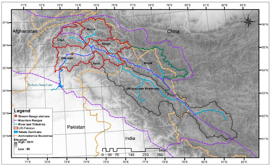 Climatic variables are usually strongly influenced by topographic altitude. Thus, the northern valley floors of the UIB are arid and warm, with an annual precipitation of only 100–200 mm. These totals increase to 600 mm at 4400 m altitude, and glaciological studies suggest annual accumulation rates of 1500–2000 mm at height of 5500 m [11]. The UIB draws more than 50% of its water from melting of seasonal and permanent snow cover in the Himalaya, Karakoram and the Hindu Kush (HKH) mountains [5,12,13,14,15]. A rise in temperature in the UIB will, therefore, result in elevated melt rates with huge impacts on the timing and magnitude of the generated flows. This will not only lead to a higher average stream flow, but also to an increase in the occurrence and magnitude of extremes, especially during high-precipitation events [16]. There is also the possibility that the peak flows may shift to earlier months or other seasons, with a rise in temperature [5] in the UIB.