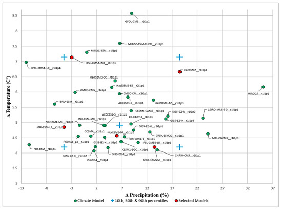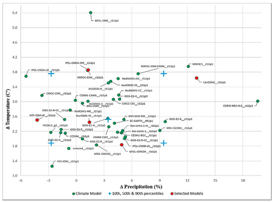 It is worth mentioning that the range of projections for ΔT and ΔP for the RCP8.5 model pool was much larger than for the RCP4.5 model pool. For the latter, more extreme RCP, ΔP ranges from −5.42% to 19.56%, and ΔT ranges from 1.26 °C to 5.41 °C; while for the former (RCP4.5), these ranges are much higher, with ΔP ranging between −12.01% and 35.12% and ΔT between 1.48 °C and 8.57 °C.