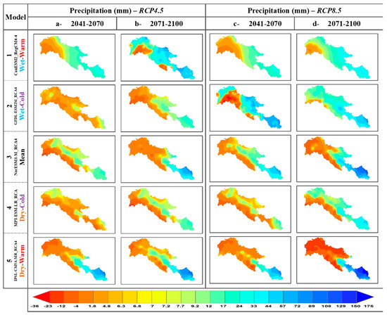 Spatial distribution of projected precipitation change across the UIB over the mid (2014–2070) and the late- (2071–2100) 21st century for 5 models and 2 RCPs. The figure is arranged in a tabular form where the 1st and 2nd column represent projected change in precipitation for RCP 4.5, for the mid-century (2014–2070) and the late-century (2071–2100), respectively, while the 3rd and 4th columns show the projected change in the mid-century and the late-century precipitation for RCP 8.5, respectively. The rows represent the climate models used.