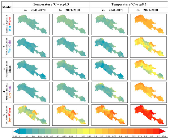 The five (5) selected (CORDEX-SA) RCM outputs were further bias-corrected using the “distribution mapping technique” [43] for RCP4.5 and RCP8.5 for two sets of durations, i.e., mid-century (2041–2070) and end-century (2071–2100). Major properties of the downscaled projections are given in Table 7.