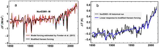 9]. In the present paper, we take part of this uncertainty into account by analyzing the spread of the adjusted forcing over the CMIP5 ensemble. We shall also consider the order of magnitude of uncertainty that can be attributed to our limited knowledge about the forcing from volcanic aerosols. In model runs with historical forcing, the adjusted forcing is obtained from Equation (