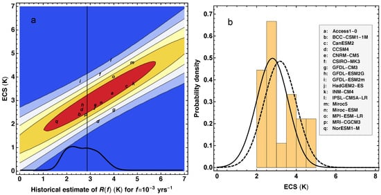 Figure 3b is the distribution of ECS in the model ensemble, and the dotted curve is a Gaussian fit to the distribution of ECS in the model ensemble. The figure demonstrates that when constrained by the scale-dependent sensitivity of the instrumental temperature record, the best estimate of ECS in the model ensemble is reduced by approximately