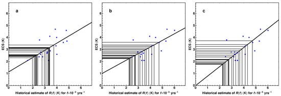 from historical runs of each of the ESMs in the CMIP5 ensemble, as well as for the instrumental temperature record. For each model, this estimate corresponds to an estimate of ECS through Equation (