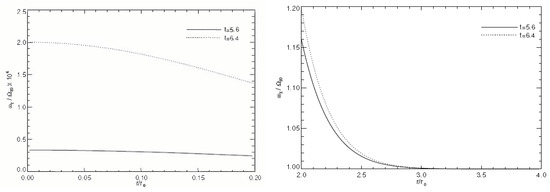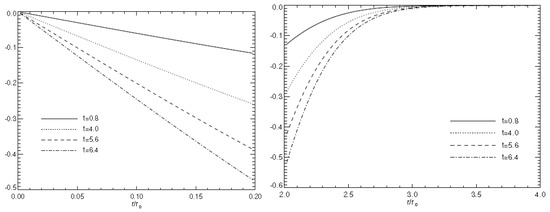 To apply these results to interpret dust vortices in the Earth’s atmosphere, let us take the characteristic value of the temperature gradient in the near-surface layer [35] as 2 K/m, which is usually measured in the near-surface layer during vortex generation. This gradient corresponds to the convective instability growth rate. Figure 1 and Figure 2 show the dependence of normalised radial and vertical components of the velocity within the time interval s and when in the radial domains or . Note, that according to Equation (4) the vertical velocity is proportional to z. Figure 2 is plotted for . In the intermediate domain corresponds to the domain where the condition (5) fails. Further investigation of this nonlinearity in the region will be carried out elsewhere. Comparing the left and right panels of Figure 1 and Figure 2, and using the interpolation behaviour of the velocities in the regions and one can assume that for the absolute value of the radial velocity attains its maximum value. Then the vertical component of the velocity, for , vanishes and then changes the sign. Figure 3 shows a strong increase in the vertical vorticity, i.e., ten times, from to s in the interior of the vortex.