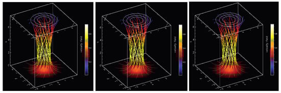 Equations (6)–(8) and (11) describe an exact solution of the Euler equations for incompressible flows in disregard of the viscosity effect. In this model, the vortex flow is exponentially localised not only in the radial direction, but also exponentially localised in the vertical direction with a characteristic scale L. The structure of the vortex in the vertical direction can be decomposed into three areas: the base (or skirt), the central part and the upper part. In the radial direction, the structure is divided into the inner and outer parts of the vortex, and , respectively. In the inner region the flow is directed to the center, and in the outer—to the outside. At the base of the vortex , the vertical and toroidal velocity components are small. As the height increases in the inner region, the vertical and toroidal components of the velocity increase. The main movement in the central area is concentrated inside the cylinder , where . At the height of the vertical and toroidal speed, as well as vertical vorticity, reach maximum values. In the upper part of the vortex, the ascending and directed to the center flow is transformed into a descending spreading flow. The normalised three-dimensional field of the velocities of the fluid motion and the particle trajectory in the vortex and pressure values across the vortex at different heights are shown in Figure 4 and Figure 5, respectively.