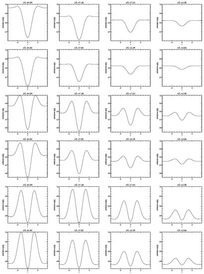 The results of numerical simulation of the evolution of a single vortex in different vertical sections of the vortex (from top to bottom) and at different times , and (from left to right).