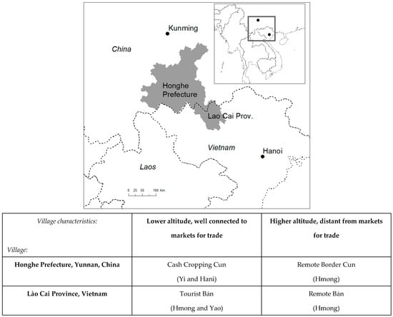 The Southeast Asian Massif—a broad expanse of mountainous uplands extending southeast from the Himalayas and shared among 10 countries—is home to more than 110 million people from diverse ethnicities [1]. Eighty million of these individuals live in southwest China and northern Vietnam where they have customarily resided in isolated rural communities while maintaining semi-subsistence livelihoods. These livelihoods, traditionally centred on staple crops of rice, maize, or cassava, as well as limited livestock, home gardens, and small-scale trade, are now being rapidly altered as a result of ongoing agrarian transitions. These transitions involve growing market integration, pluriactivity, and industrialisation, in addition to commercial intensification, and new infrastructure and communications technologies. In turn, these transitions are resulting in ethnic minority farmers increasingly needing cash for the procurement of industrial farm inputs, food, rising education and healthcare costs, and the hiring of farm labour.